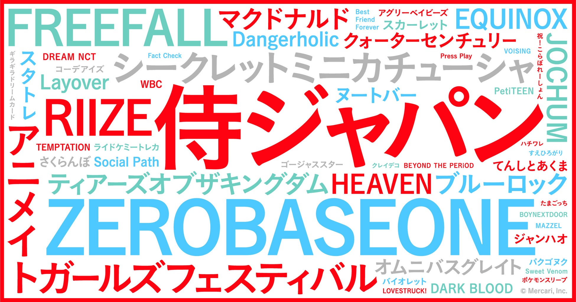 2023年もっともトレンドとなったワードは、韓国のボーイズグループ「ZEROBASEONE」となり、続いて2023 WORLD BASEBALL CLASSIC™優勝による「侍ジャパン」でした。