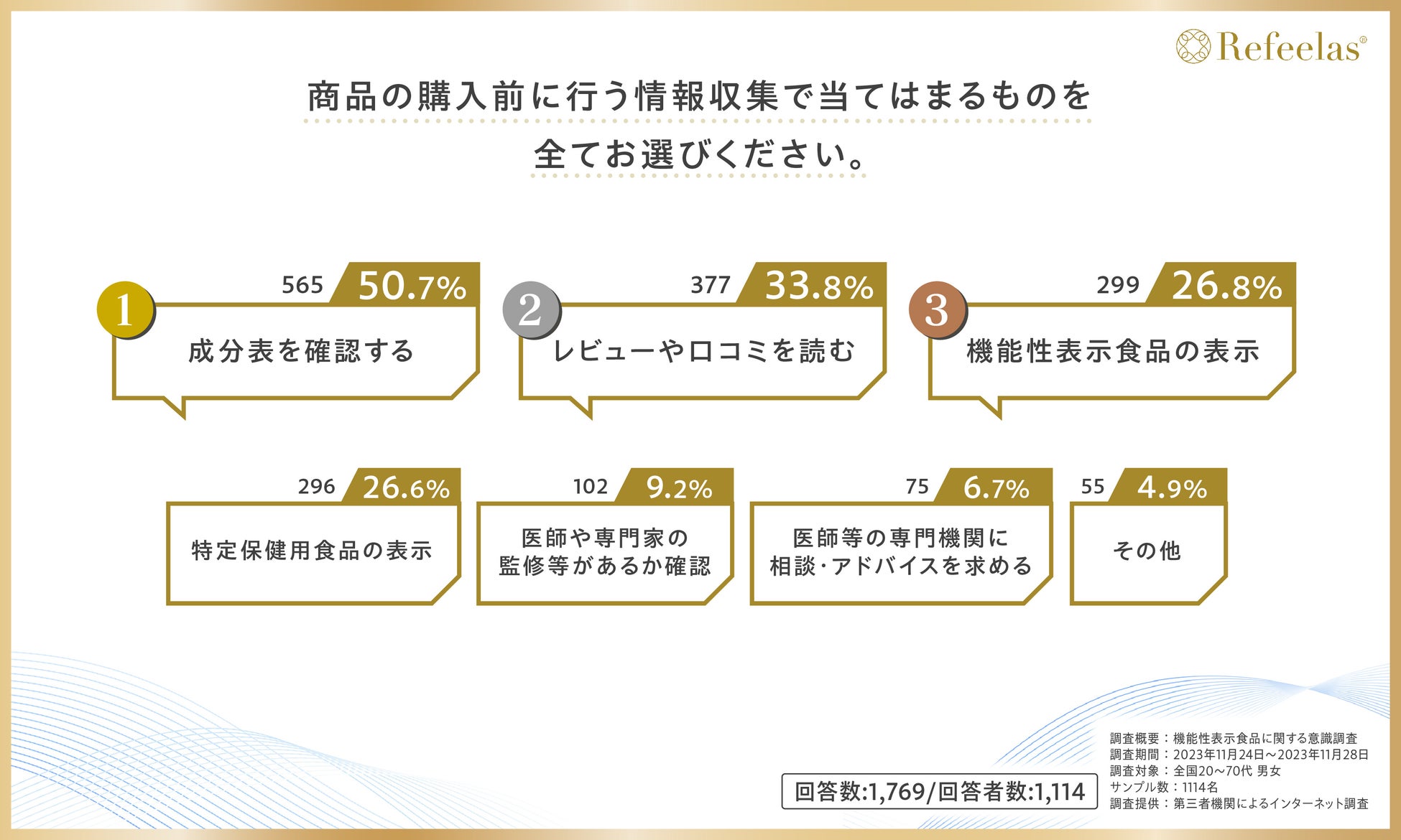 半数以上の方が『成分表を確認する(50.7%)』、比較などを気にする方が約3割『レビューや口コミを読む(33.8%)』、特定の機関に認められているという安心感を求める方も3割程度『機能性表示食品の表示(26.8%)』