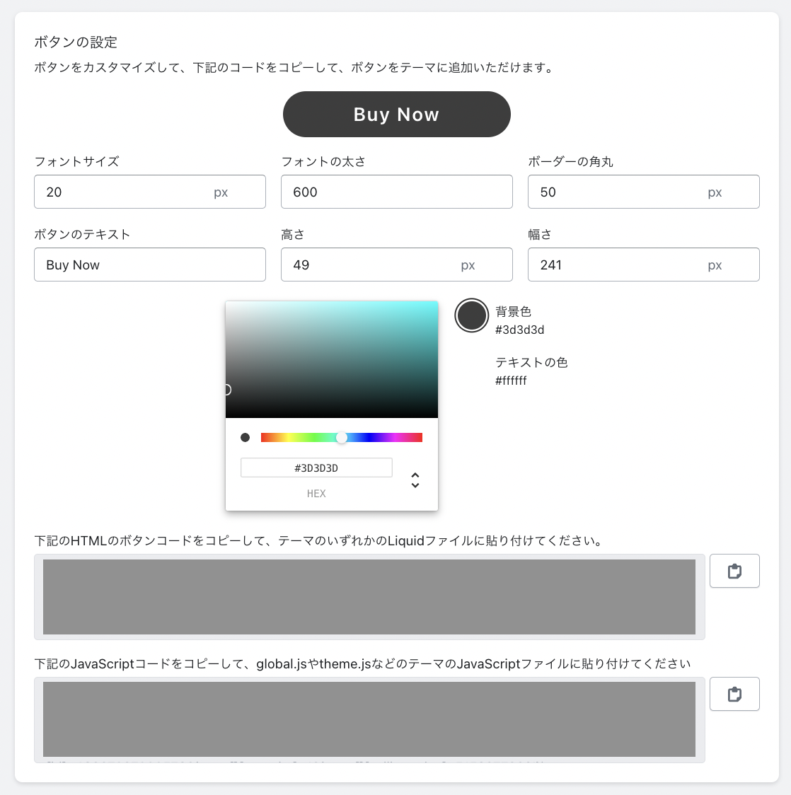 アプリ内でボタンのLiquidとJavascriptコードが自動的に生成され、そちらを使用して、自分で直接テーマに追加いただけます。