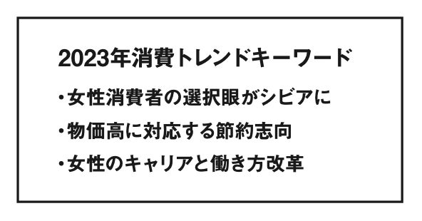 2023年は新型コロナウィルスが収束し、世界経済、日本経済の両方で回復が見られました。しかし、消費者側に立つと国際的な原材料価格の上昇や円安の影響によって家計は大きな影響をうけています。中でも日常の必需品の価格上昇は、女性たちの支出パターンに変化をもたらしています。コロナ禍で経験した健康への意識の高まりと同時に、価格に対するシビアさも同時に兼ね備えた消費者は、「実」がとれる商品をよりお得に買うことに知恵を絞り、情報収集にも余念がありません。また、働く女性が増え、男女共に育児家事に参加する社会になりつつあるとはいえ、女性の家事育児負担度は大きく、結婚出産育児という人生コース選択への躊躇や、選択した場合の妊活や子育て環境からの職場変更や自分にとっての働き方改革を推し進める女性が増加しています。