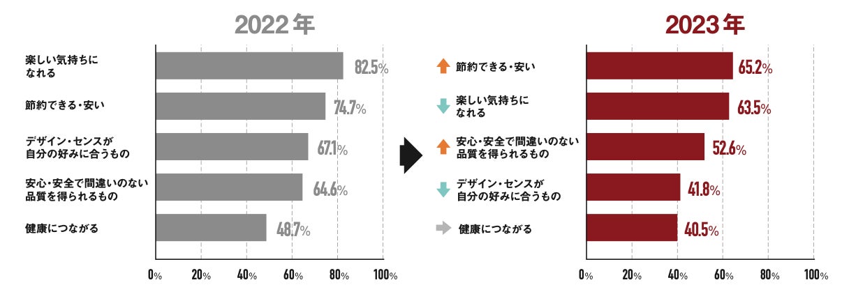 2022年の1位は「楽しい気持ちになれる」でしたが2023年には「節約できる安いもの」が1位となりました。2023年は物価高騰や円安の影響で、消費者の節約意識が高まっていることが背景にあると考えられます。