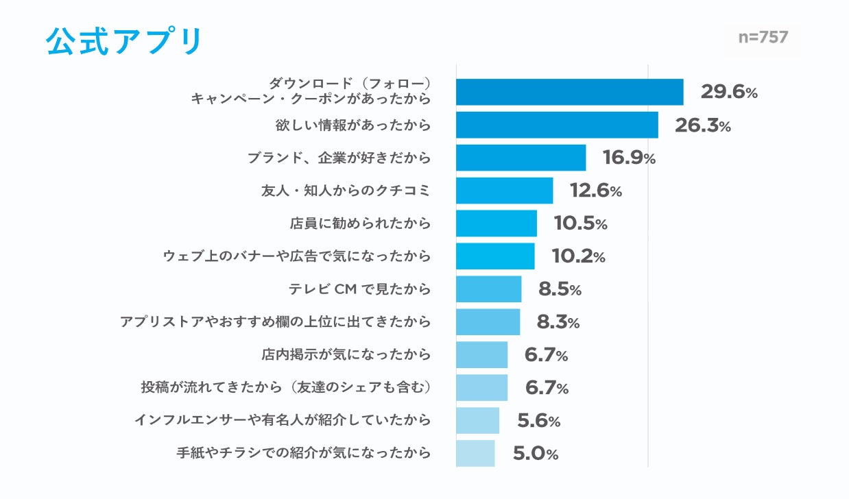 - 公式アプリのDLきっかけは「欲しい情報があったから」、「ブランド、企業が好きだから」が、「ダウンロードキャンペーン・クーポンがあったから」に次いで上位に。
