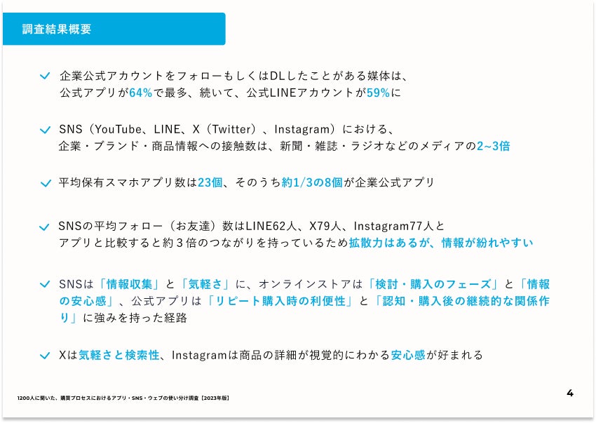 - SNSは「情報収集」と「気軽さ」に、オンラインストアは「検討・購入のフェーズ」と「情報の安心感」、公式アプリは「リピート購入時の利便性」と「認知・購入後の継続的な関係作り」に強みを持った経路