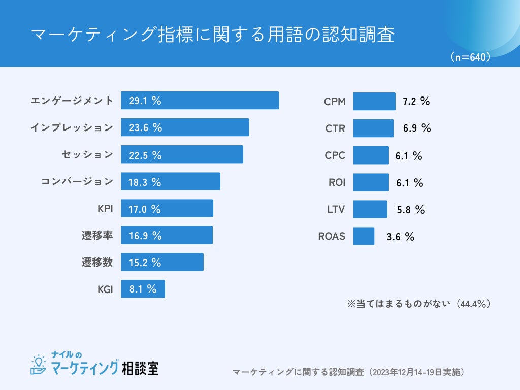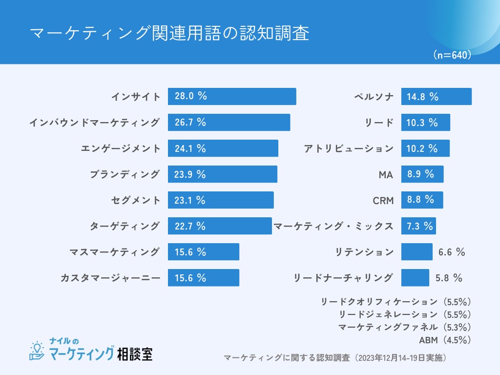 「ナイルのマーケティング相談室」を運営するナイル株式会社(本社:東京都品川区、代表取締役:高橋 飛翔、以下、ナイル)は、全国男女640名を対象に、マーケティングに関連する用語の認知調査を実施しました。
