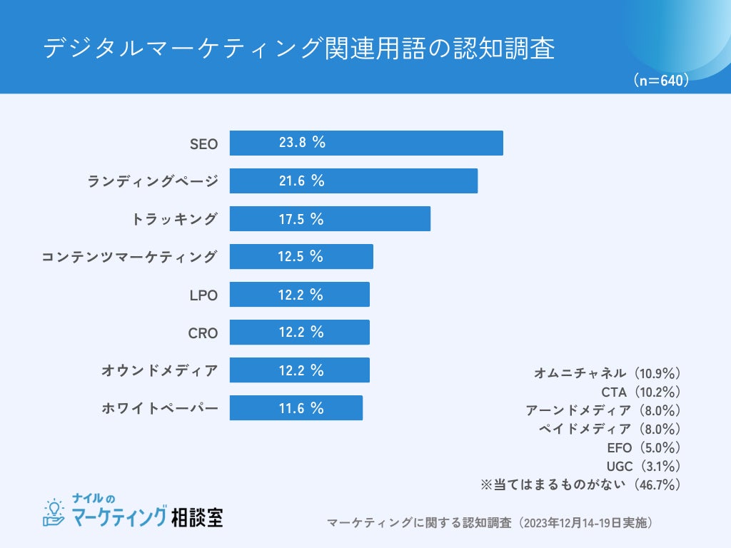 デジタルマーケティング関連用語の認知調査をした結果、最も多く知られている言葉は「SEO(23.8%)」でした。次いで、「ランディングページ(21.6%)」、「トラッキング(17.5%)」と続きました。