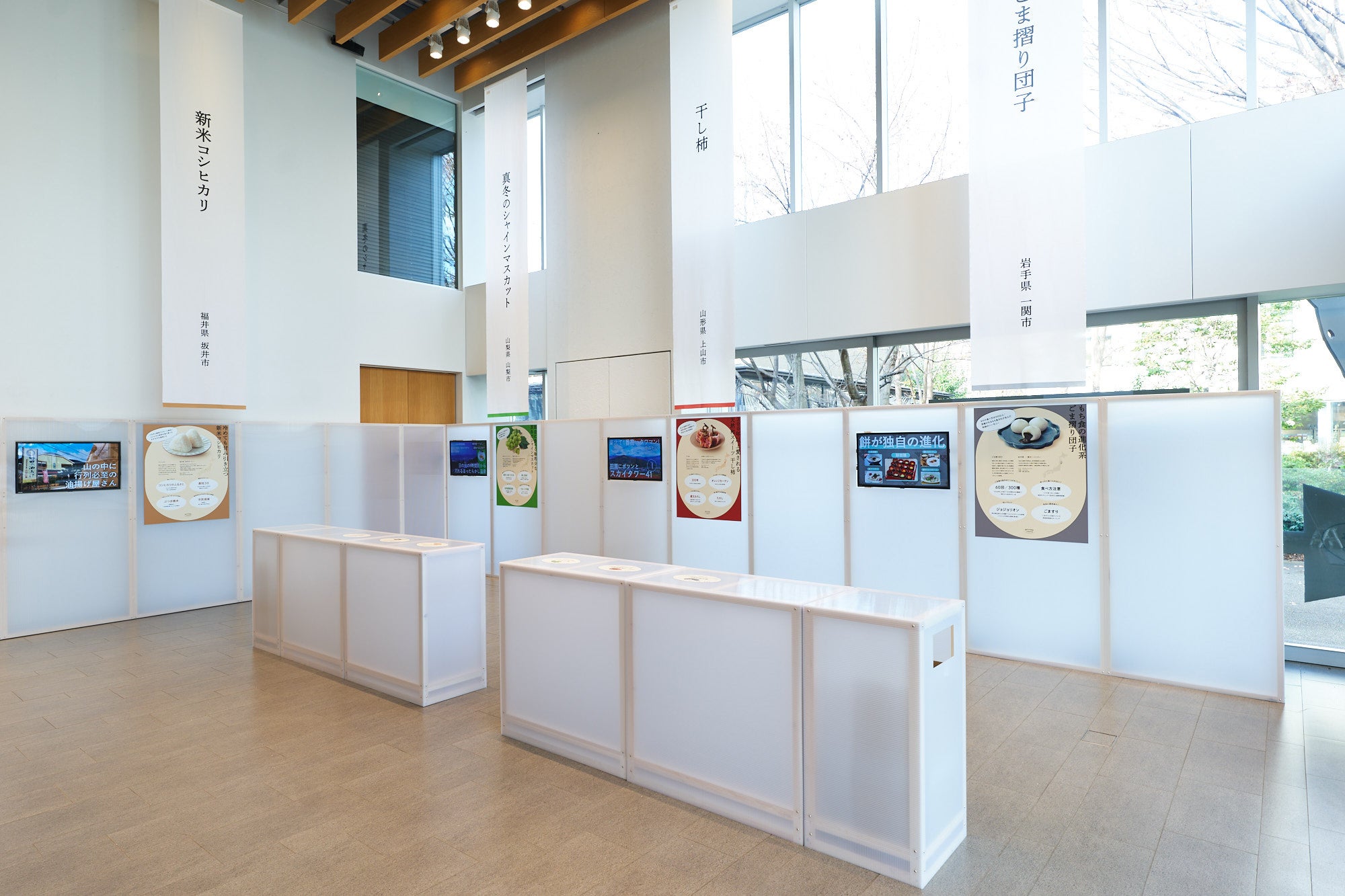 「いくら(生・醤油漬け)」「エゾバフンウニ」「コシヒカリ」「真冬のシャインマスカット」「干し柿」「ごま摺り団子」をワンプレートにして提供。会場内の順路と同じ並びに配置されています。