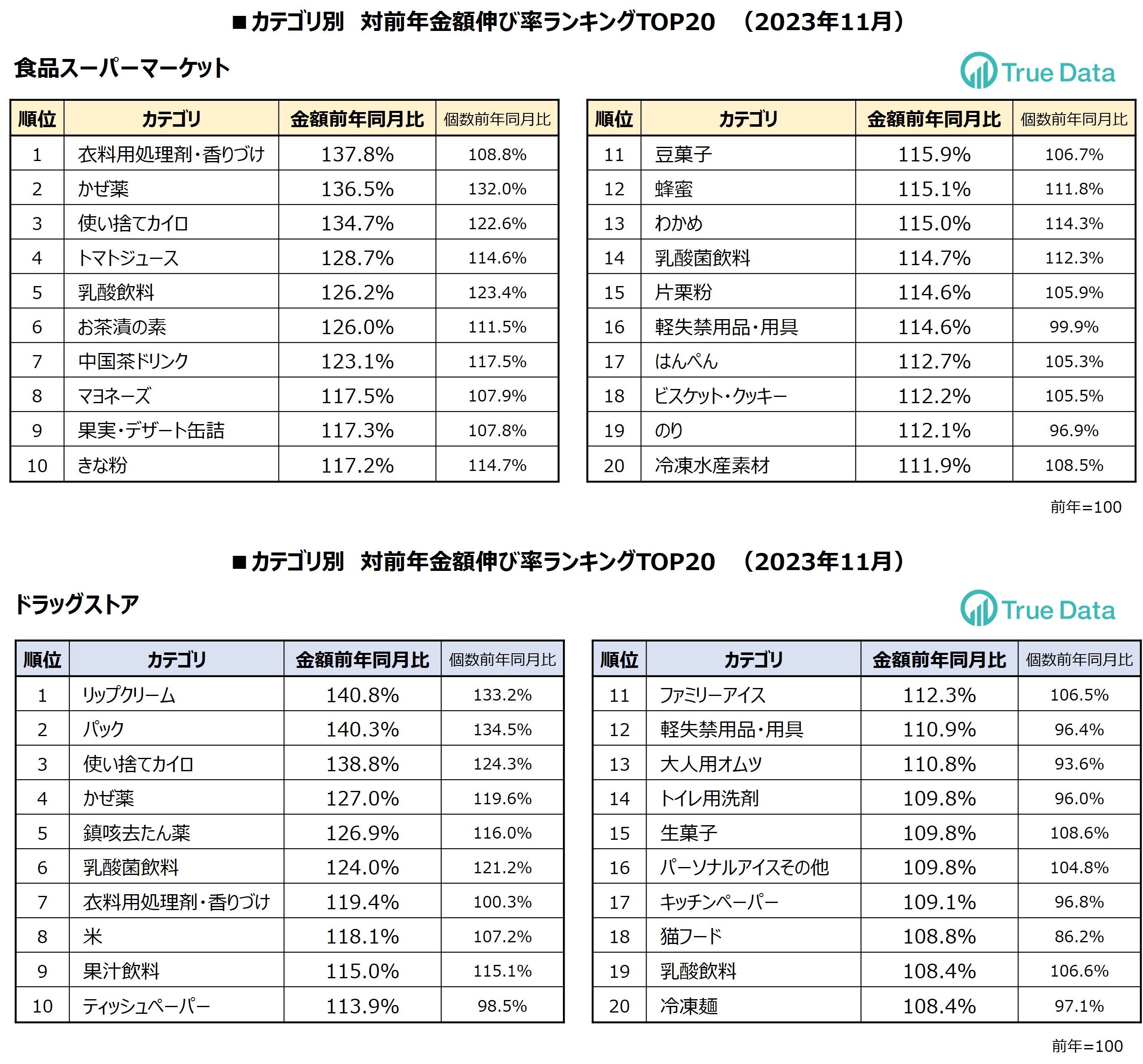 ビッグデータプラットフォームを運営する株式会社True Data(トゥルーデータ/本社:東京都港区、代表取締役社長:米倉 裕之、証券コード4416)は、当社の統計データをもとに、ドラッグストア、食品スーパーマーケットにおける2023年11月の売り上げ伸長カテゴリを発表します。ドラッグストアで「リップクリーム」の売り上げが前年同月と比べ40.8%増加しました。前年までマスク着用により需要が減少していた反動も考えられます。今後マスクで隠れていた部分の化粧品がどのような動きをみせるのか注目されます。