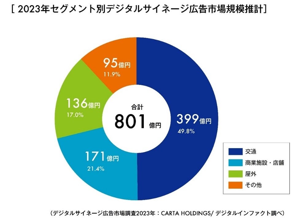 2023年のデジタルサイネージ広告市場規模は前年比119%、801億円と推測されます。交通機関は399億円で全体の49.8%、商業施設・店舗は171億円で全体の21.4%、屋外は136億円で全体の17.0%、そしてその他は95億円で全体の11.9%を占めると推測されます。
