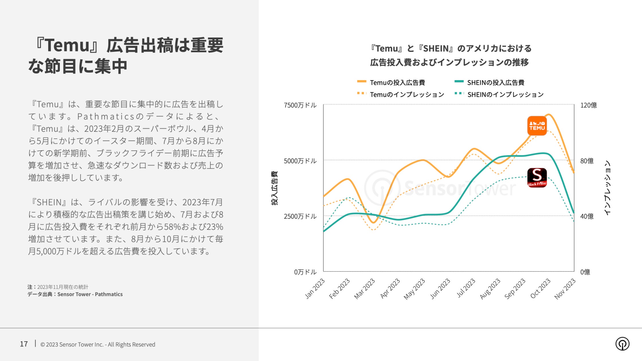 Sensor Towerデジタル広告分析プラットフォームPathmaticsのデータによると、2023年1月から11月までに『Temu』がアメリカで投じた広告費は5.1億ドルに達し、前年同期と比べて17倍増加しています。『Temu』は、スーパーボウル、秋の新学期前、ブラックフライデーなどのマーケティングの重要な節目に広告費を増加させており、トラフィックの増加が『Temu』の急速なアメリカ市場開拓を支えています。