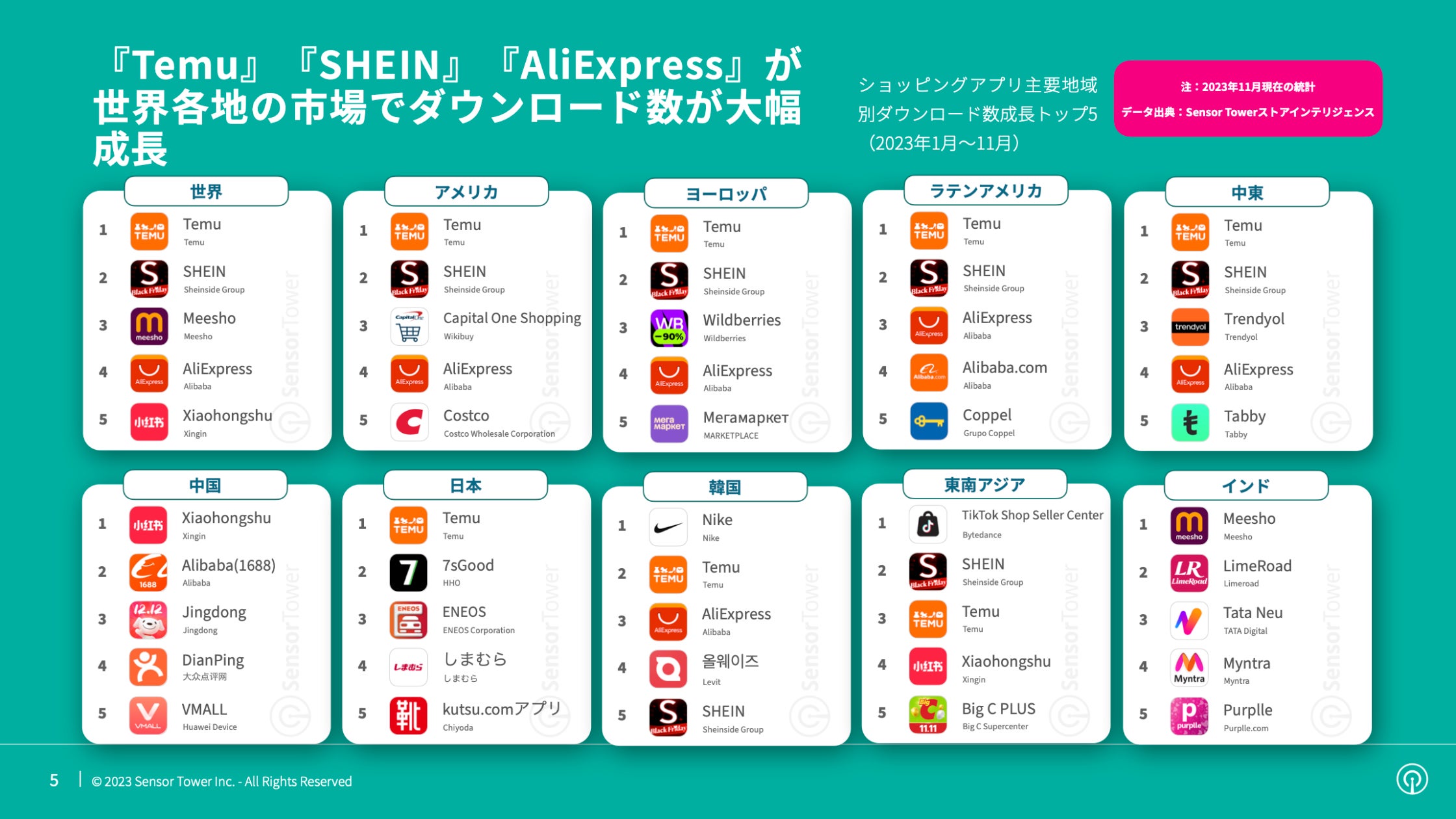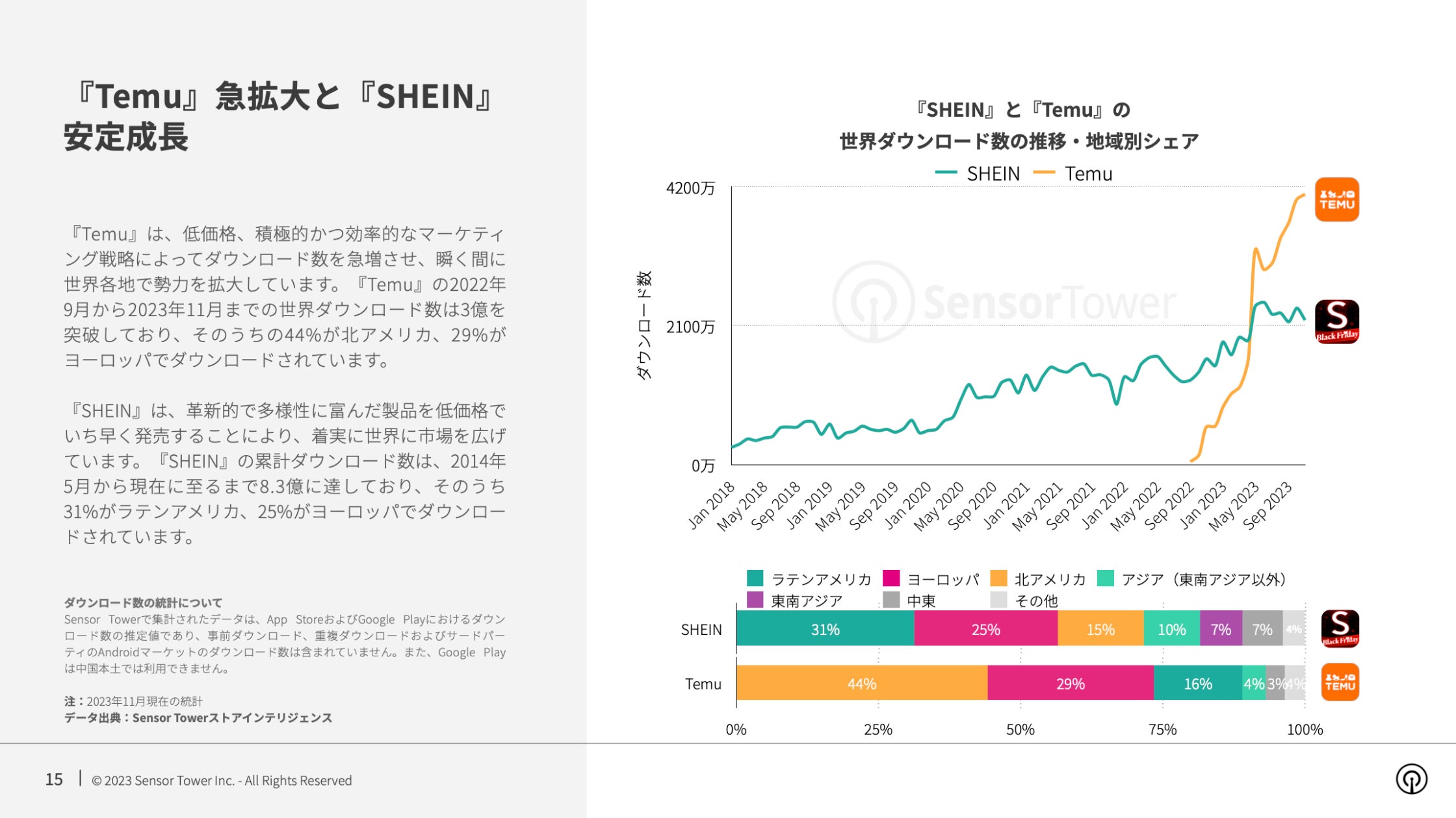 2023年、『Temu』および『SHEIN』のダウンロード数が急成長し、アメリカ、ヨーロッパ、ラテンアメリカ、中東のショッピングアプリ成長ランキングでトップをうかがい、『Amazon』や『Shopee』を抜いて世界で最も人気のショッピングアプリとなっています。
