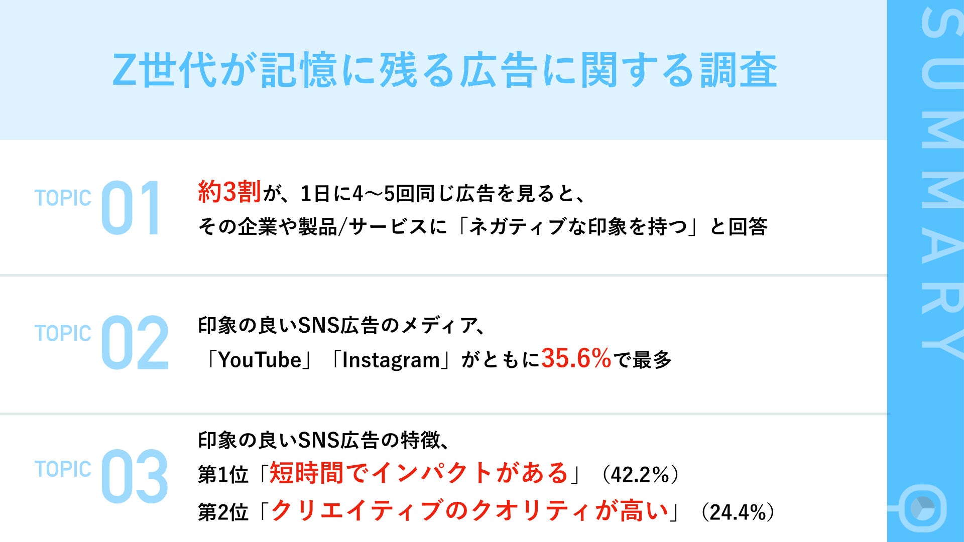 今回の調査では、Z世代が接触回数の多いSNS広告に対してネガティブな印象を持っていることが明らかになりました。一方で、短時間でインパクトがあるSNS広告は記憶に残りやすく、印象が良いと感じているようです。Z世代をターゲットとしたSNS広告を展開する上では、接触回数を増やすよりも、記憶に残りやすい広告を提供することが鍵になるのではないでしょうか。