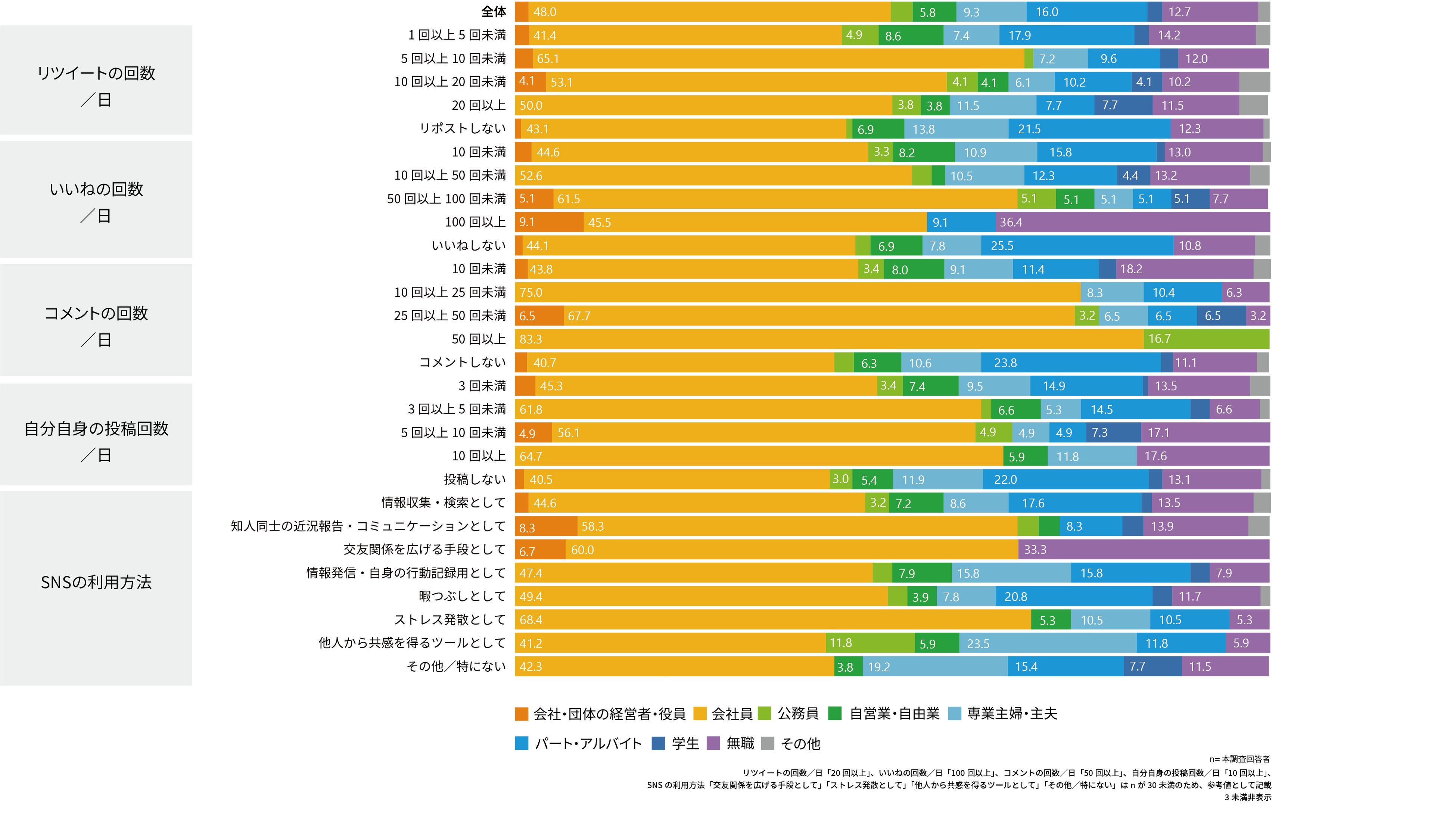 - 「会社員」の層の使用頻度が高く、内容としては、「いいね」「コメント」「自分自身の投稿」が多い