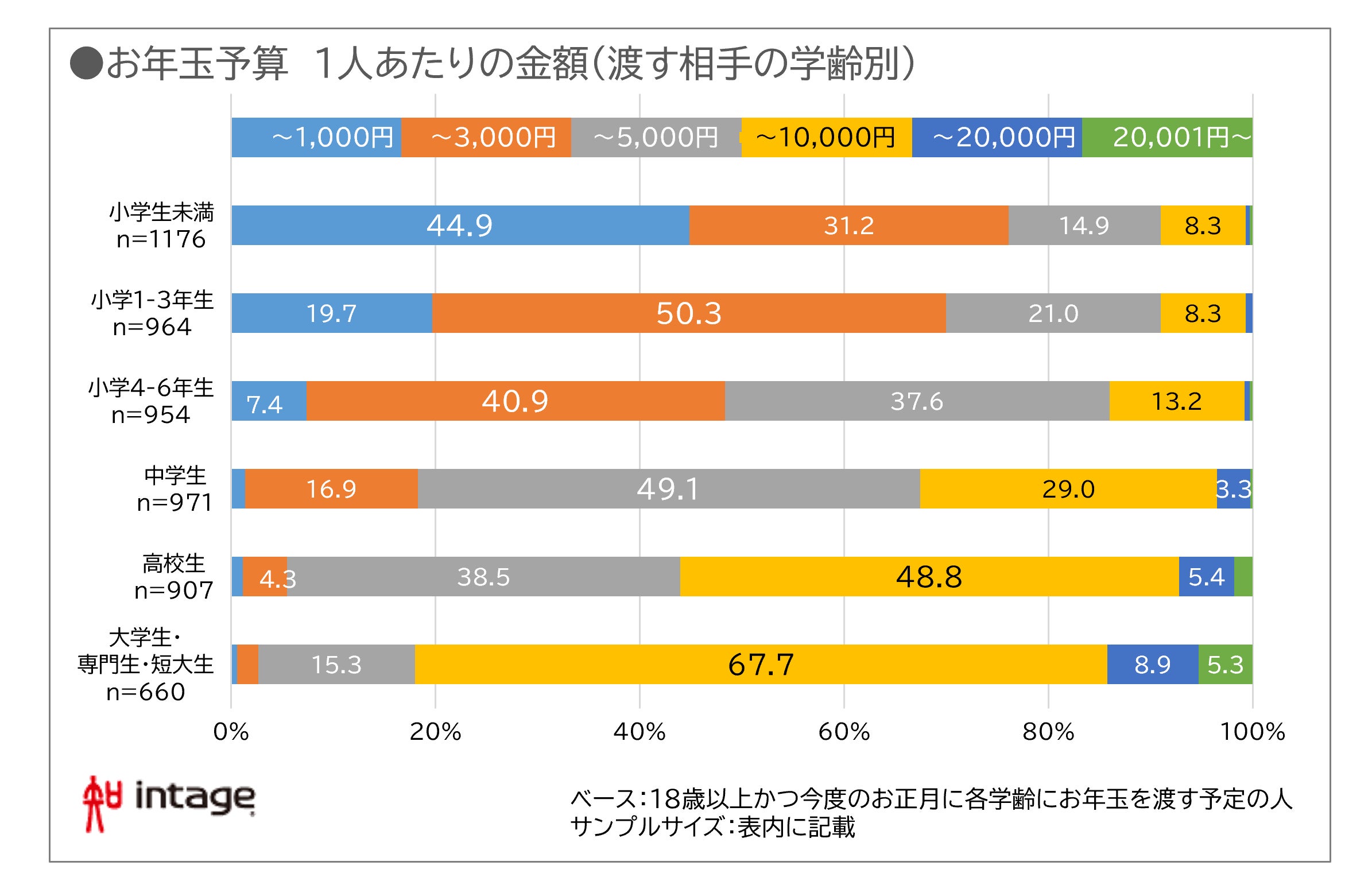 それでは、1人に渡す金額はどうでしょうか。渡す相手別に確認しました。それぞれの学齢で最も多かったのは、小学生未満「~1,000円」(44.9%)、小学1-3年生「1,000円超~3,000円」(50.3%)、小学4-6年生「1,000円超~3,000円」(40.9%)、中学生「3,000円超~5,000円」(49.1%)、高校生「5,000円超~10,000円」(48.8%)、大学生・専門学校生・短大生「5,000円超~10,000円」(67.7%)(図表3)。