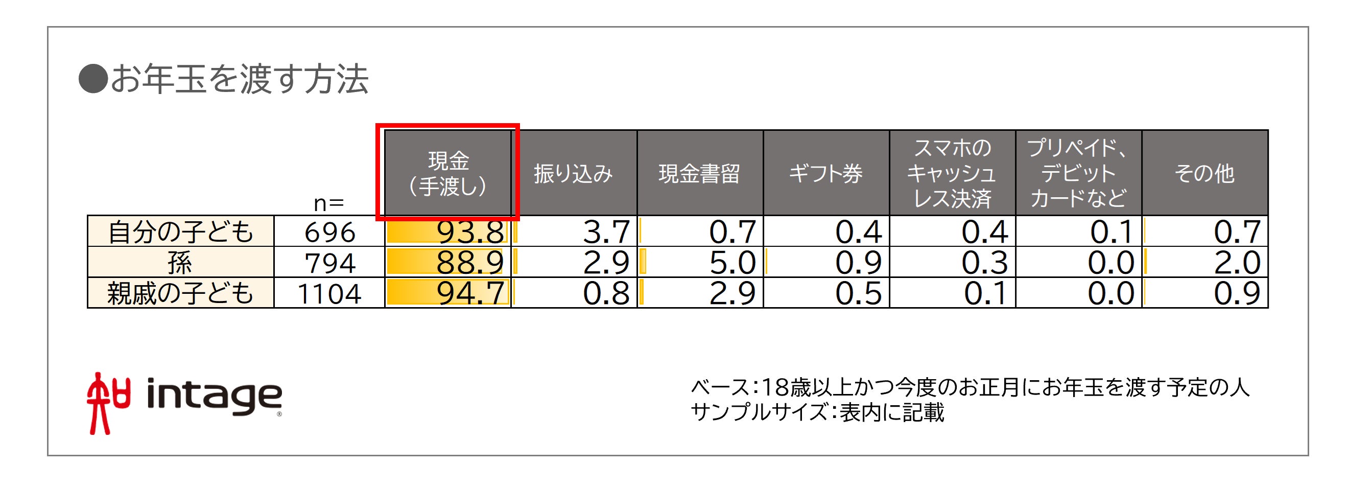 ・渡す方法は「現金(手渡し)」が9割と大多数、「スマホのキャッシュレス決済」は1%未満で昨年と大きな変化なし