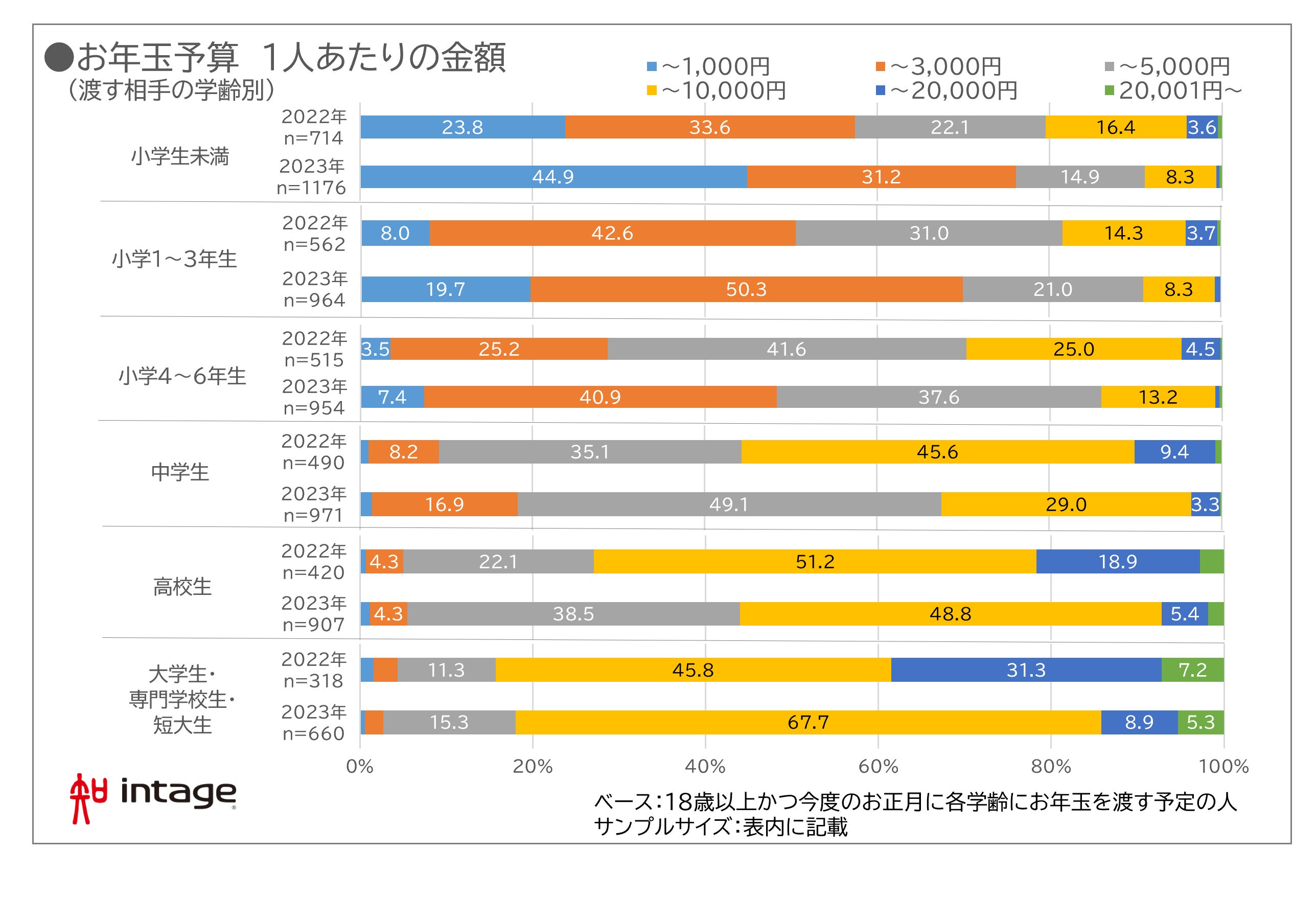 さらに1人に渡す金額を昨年と比較すると、どの学齢においても減少していました。例えば小学生未満では、昨年23.8%だった「~1,000円」が44.9%と倍増しトップに。また、昨年は「5,000円超~10,000円」が45.6%と最も多かった中学生では、「3,000円超~5,000円」(49.1%)が相場へと変動しました(図表4)。