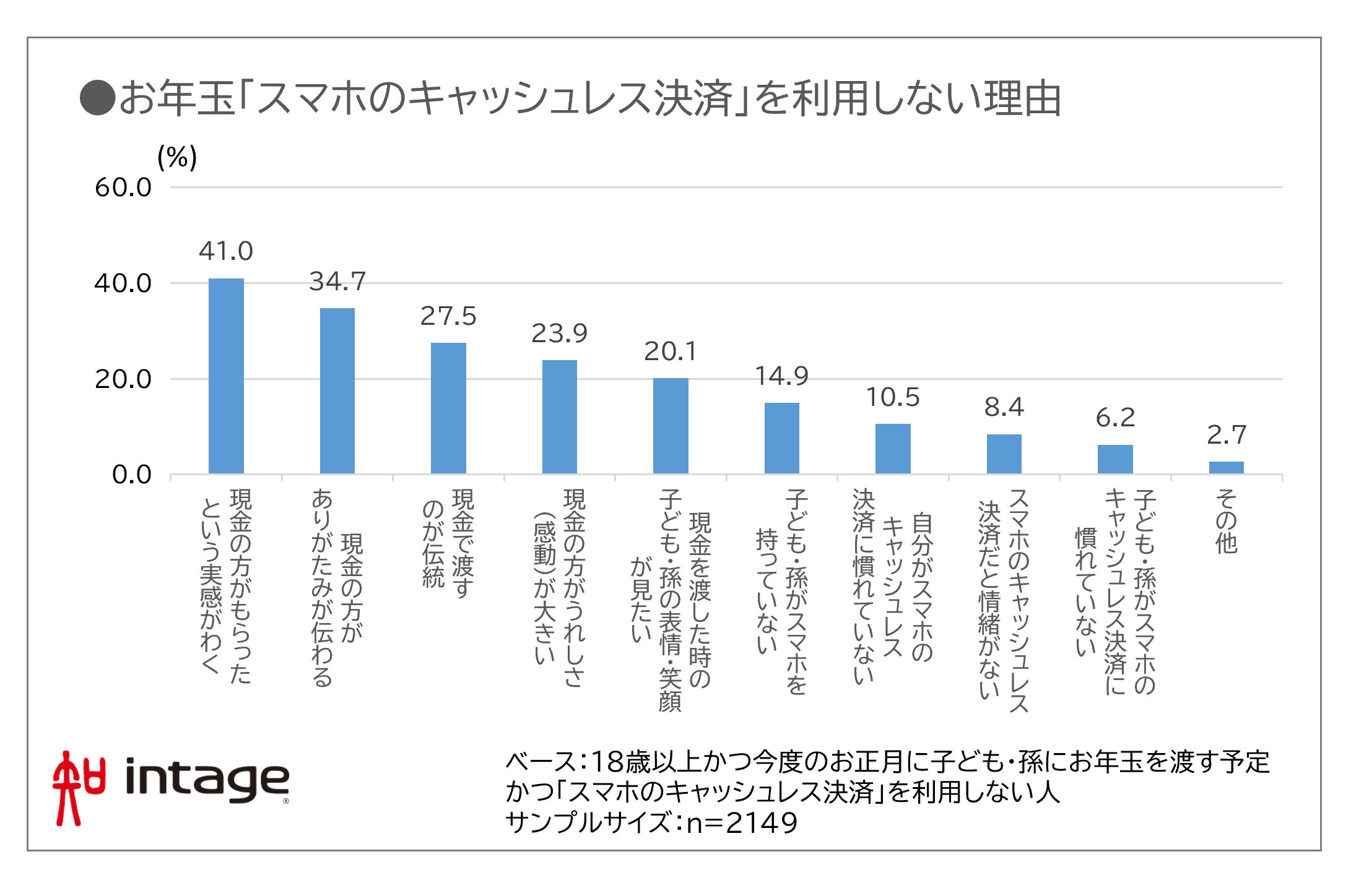 お年玉の渡し方に「スマホのキャッシュレス決済」を選択しない理由としては、「現金の方がもらったという実感がわく」(41.0%)がトップでした。5位の「現金を渡した時の子ども・孫の表情・笑顔が見たい」(20.1%)は昨年から3ptアップ。祖父母世代がリアルで孫に会う機会が昨年からさらに増え、相手の喜ぶ顔を楽しみにしている様子がうかがえます(図表6)。