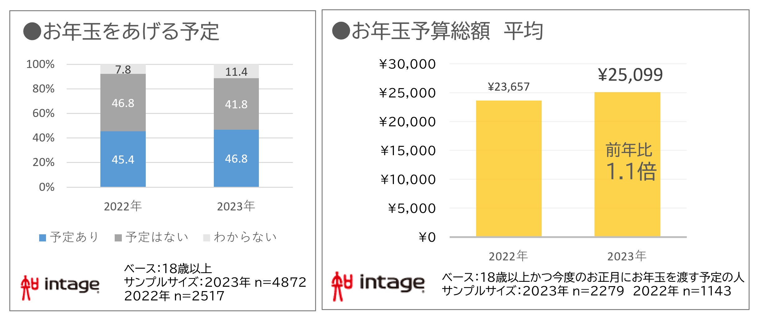 インテージで実施した各種調査からも、物価高や円安影響はありつつもイベントの活気が一定回復しつつあることが分かっています。年末年始の帰省等に伴う親族・知り合いに会う機会の増加と連動して、お年玉をあげる予定が増え(あげない予定が減り)、予算引き上げにつながったと考えられます。ただし当社調査結果でのハロウィン予算が昨年比1.4倍、年末年始予算が同1.3倍といった顕著な増加と比較すると、お年玉にかける予算の伸び率は小さい状況です。