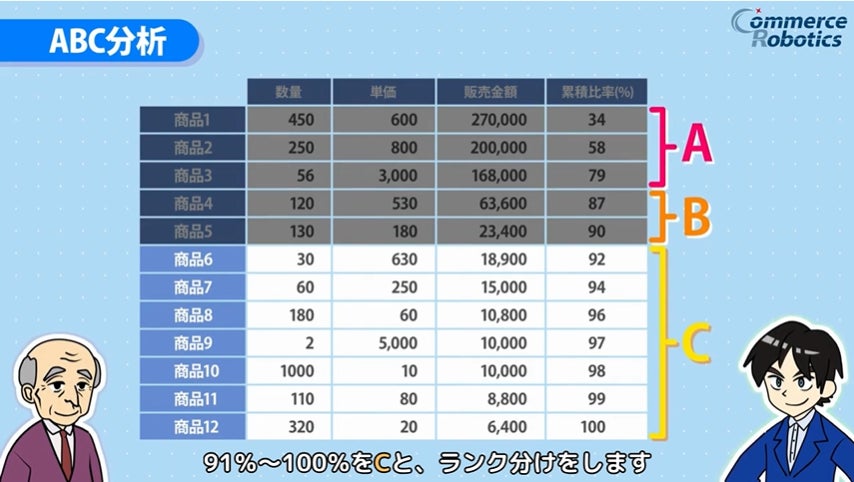 売上ベース、出荷数ベース、粗利ベースで週間、月間ABC分析が可能です。