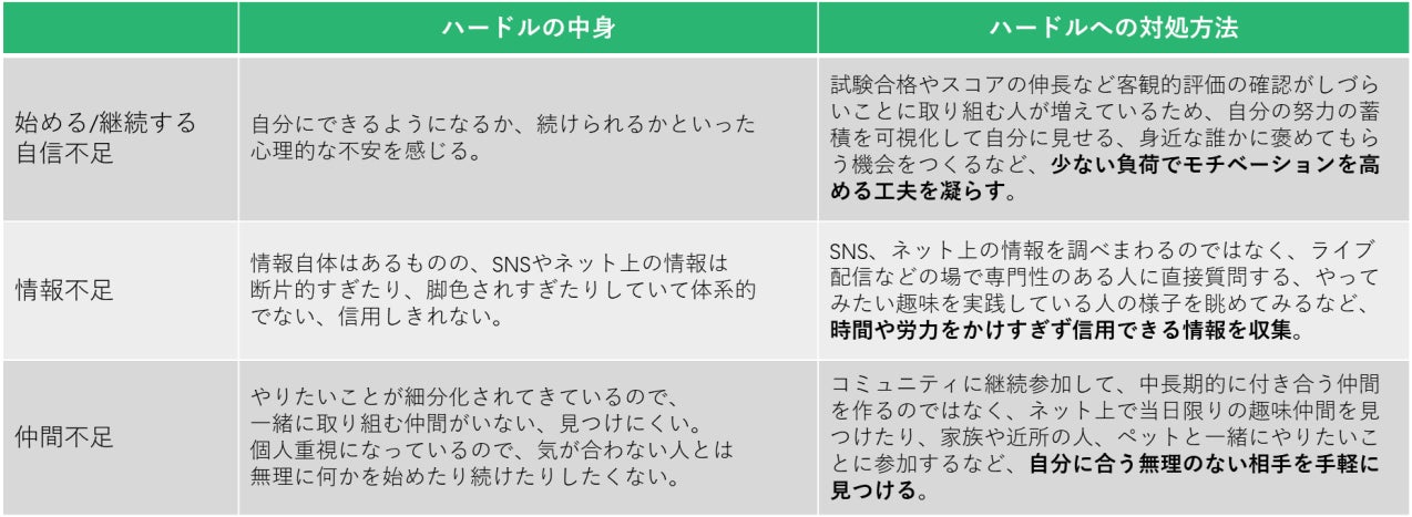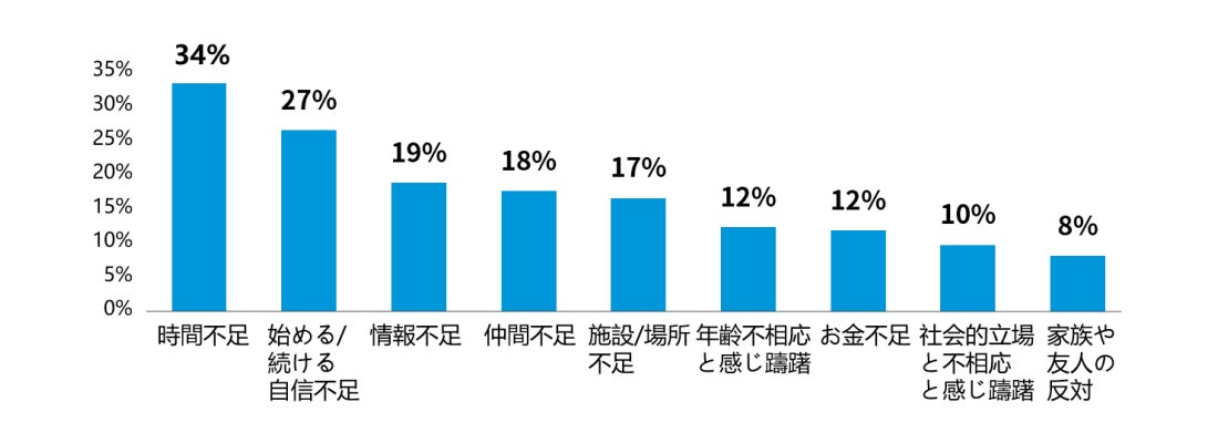ハードルとなるのは、「時間不足」のほか、「始める/続ける自信不足」や「情報不足」、「仲間不足」。