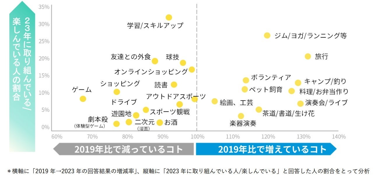 学習/スキルアップ、ゲーム、多人数で行うスポーツなどが減少し、個人でもできる趣味が増加