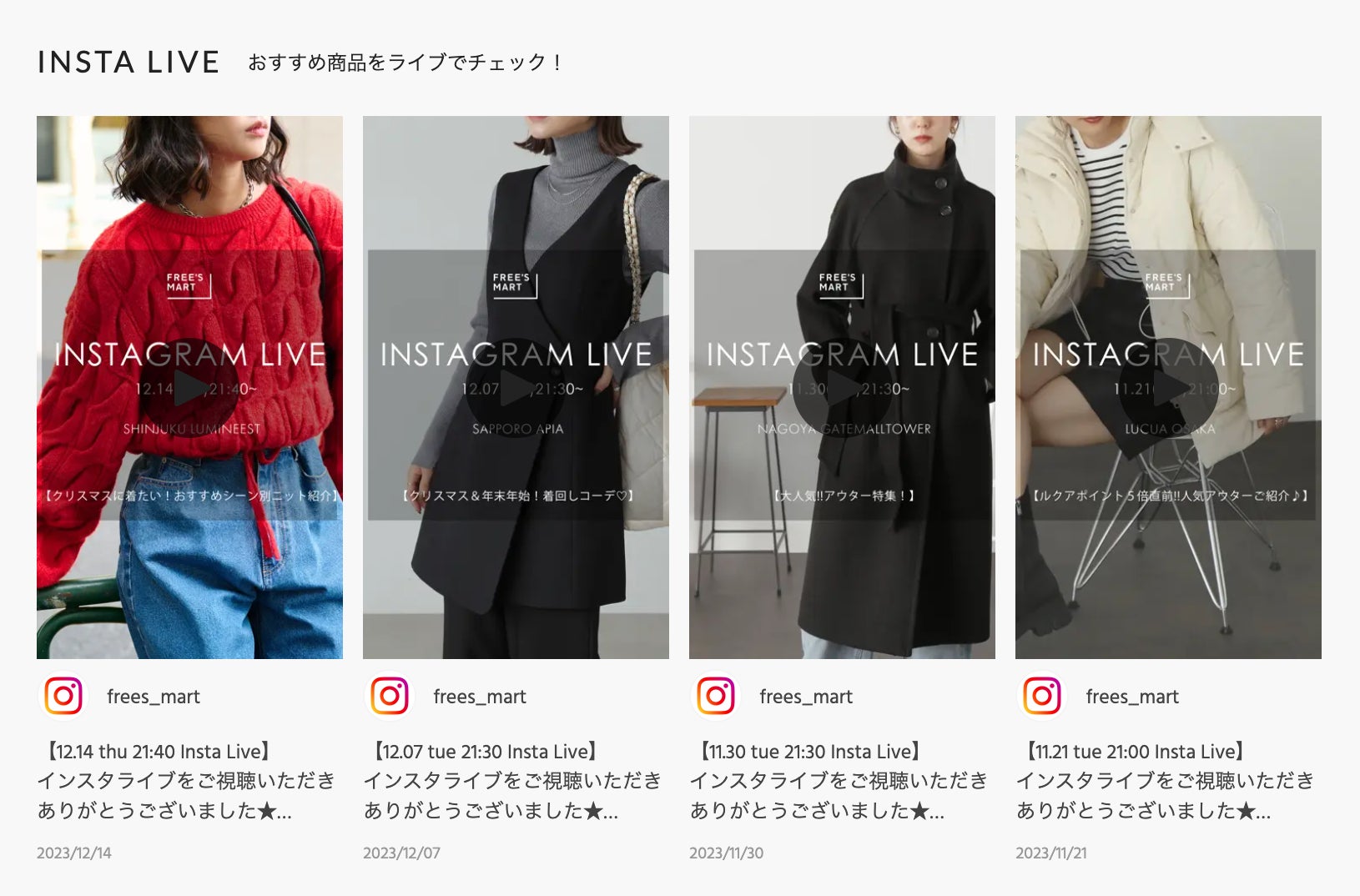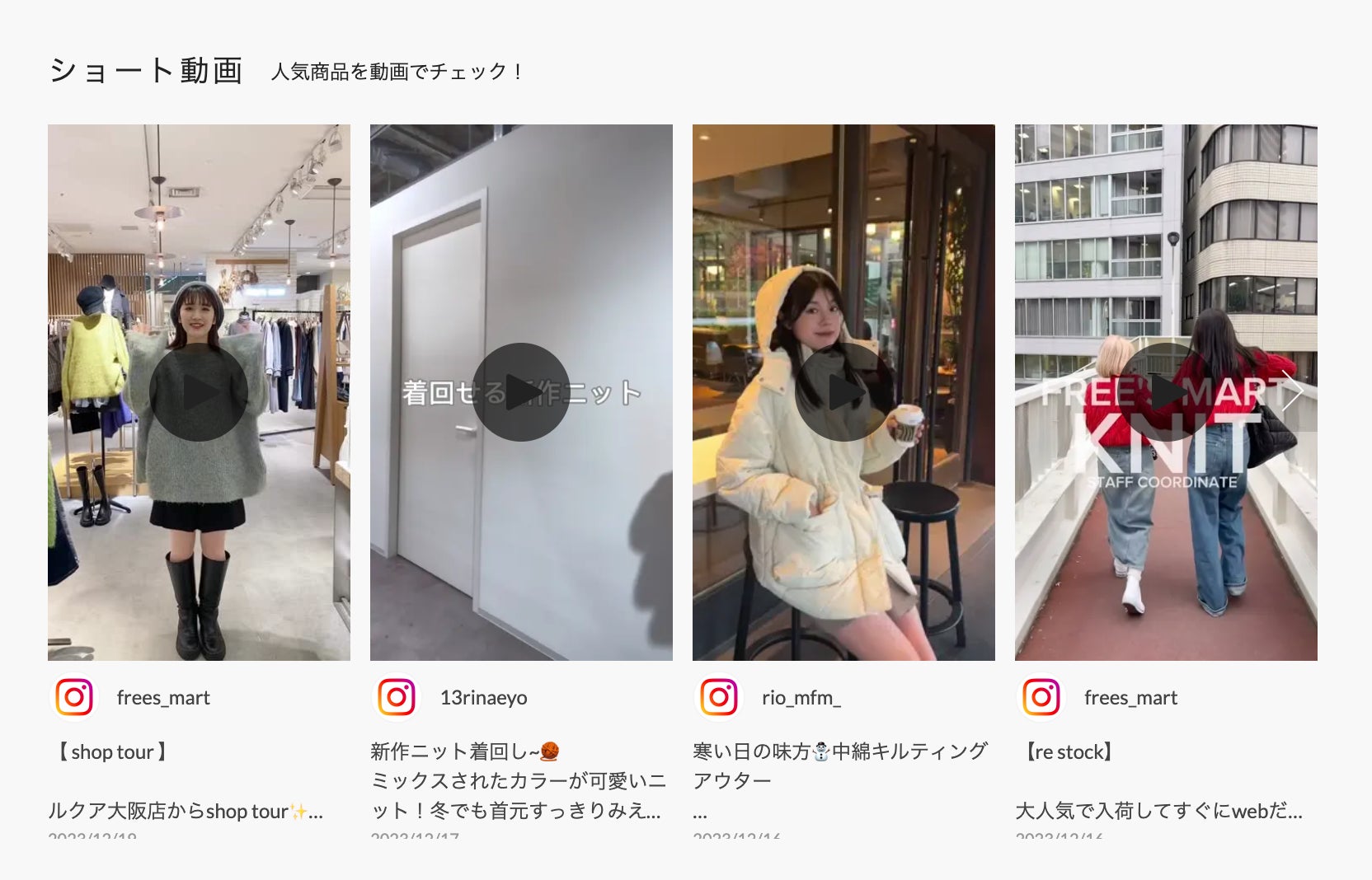 動画の活用方法としては、自社スタッフやブランド公式アカウントがInstagram上で公開しているリール・ライブ動画をLEEEPで収集し、ブランドのトップページに「ショート動画」「INSTA LIVE」として一覧で掲載しています。これにより、顧客は商品やブランドの世界観をより身近に感じることができます。