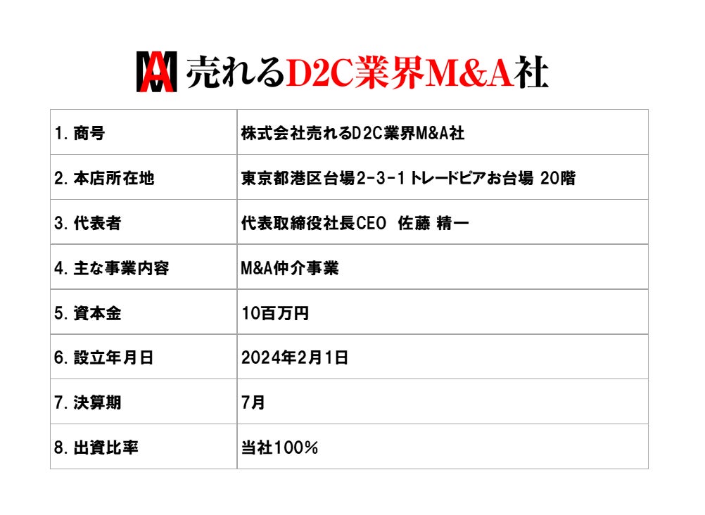 株式会社売れるネット広告社(本社:福岡県福岡市、代表取締役社長CEO:加藤公一レオ、東証グロース市場:証券コード9235、以下 売れるネット広告社)は、本日開催の取締役会において、D2C(ネット通販)業界に特化したM&A仲介事業を行うことを目的に、売れるネット広告社の100%子会社として株式会社売れるD2C業界M&A社(本社:東京都港区、代表取締役社長CEO:佐藤精一、以下 売れるD2C業界M&A社)を設立し、当該子会社にて新規事業を開始することを決議いたしました。