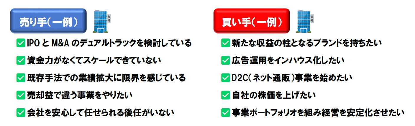 「D2C(ネット通販)事業の売上が伸び悩んでいる会社が、外部のリソースや知見を活用することにより売上を伸ばしていく」、あるいは「売れる可能性を秘めた素晴らしい商品を持っているものの、資金が足りず事業撤退せざるを得ない会社が、資金力がある会社のもとで事業を存続させ売上を拡大していく」など、M&Aを活用すれば会社の未来の選択肢の幅を広げることができます。あくまでM&Aは会社を成長させていく上での手段の一つなのです。