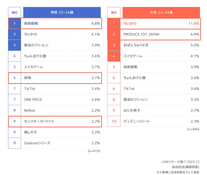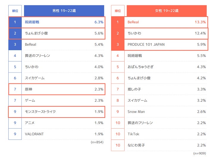 男性は、15~18歳では『ひき肉です』の挨拶が人気の「ちょんまげ小僧」 が1位、19~22歳でも2位となっています。女性でも15~18歳の年齢層で2位となっており、若年層の中でも下の年齢層でより話題になっている様子です。男性は、「呪術廻戦」がすべての年齢層で2位以内に入っており、19~22歳、23~24歳の年齢層では1位となりました。「原神」や「モンスターストライク」などのゲームタイトルも男性すべての年齢層でランクインする結果となっています。
