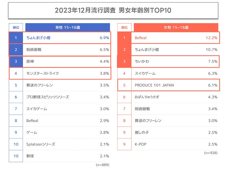 - 【最新12月期男女別】女性15~22歳では「BeReal」が1位。「葬送のフリーレン」「スイカゲーム」は男女各年代でランクイン