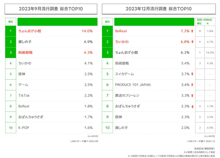 LINEリサーチでは、全国の15〜24歳の若年層の男女を対象に、四半期ごとに最近の流行についてアンケート調査(自由記述形式)を実施しています。2023年下半期は9月、12月の2回、調査を実施しましたので、その調査結果をお知らせします。