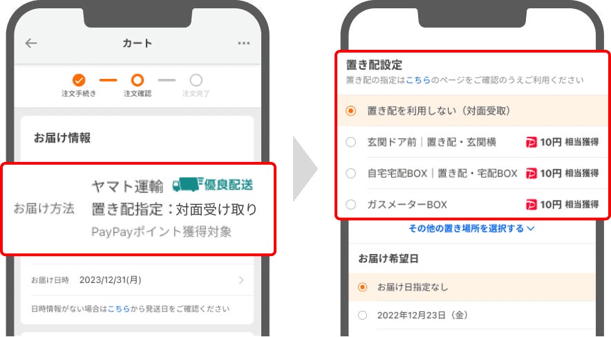 本キャンペーンは、本日から2月10日(土)までを第一弾とし、計3回開催します(今後も同様の企画を行う可能性があります)。ユーザーが配送方法を玄関ドア前や自宅宅配BOXなどの置き配に指定すると、10円相当のPayPayポイントを付与します。