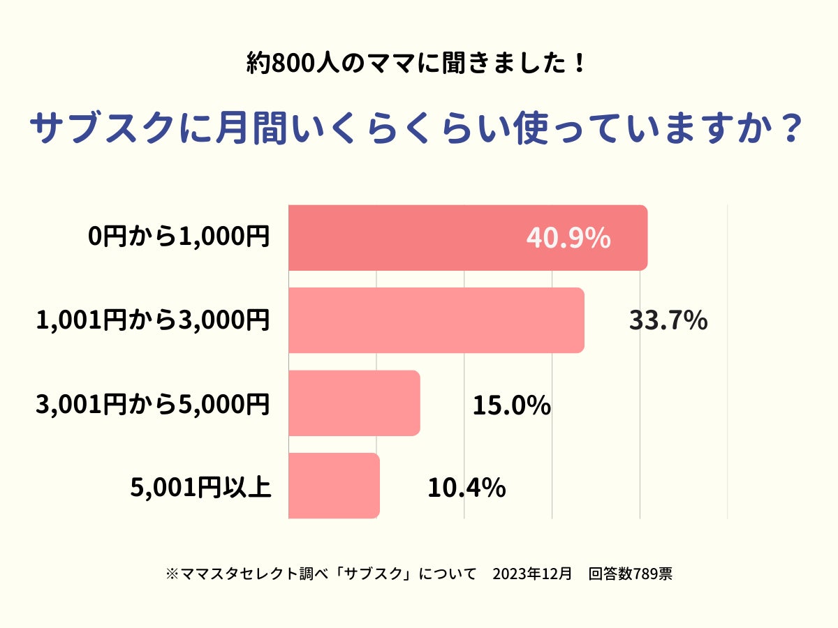 もっとも多い回答を得たのは「0円から1,000円」で323人、全体の4割にのぼりました。なかには「育休中の収入減による節約のためにサブスクを解約した」という声もあり、収入あるいは家計の状況によって「サブスクの月額が高い」と感じている人もいるようです。