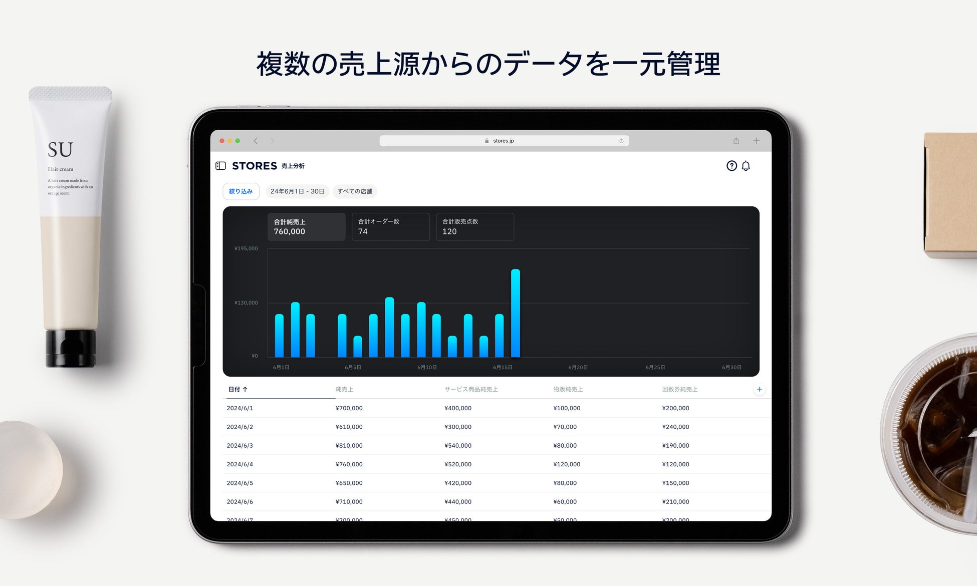 STORES 予約 の事前決済売上と、STORES レジ の現地決済の売上をまとめて把握できます。また、期間別・メニュー別の分析も可能です。