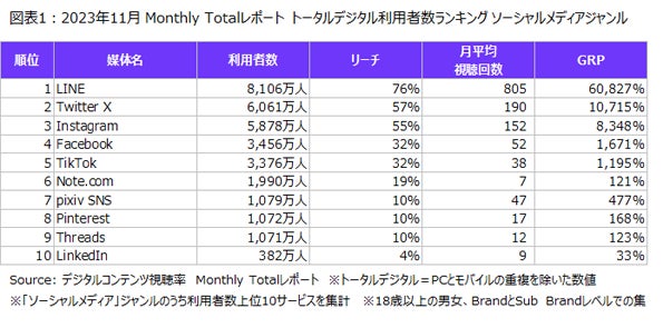 2023年11月のニールセン デジタルコンテンツ視聴率 Monthly Totalレポートによると、ソーシャルメディアジャンルのうちPCとモバイルの重複を除いたトータルデジタルの利用者数が最も多かったのは「LINE」で8,106万人が利用していました。2023年7月にサービスを開始した「Threads」は「Instagram」利用者のうち約6人に1人が利用し、利用者数は1,071万人まで成長していました。利用頻度は「LINE」が最も多く月805回利用、「Twitter X」が190回、「Instagram」が152回で続いていました(図表1)。