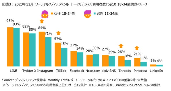 最後に、18-34歳におけるリーチを男女別に見ると、男女ともに「LINE」のリーチが最も高く、2位は女性では「Instagram」、男性では「Twitter X」となっていました。また、男女間のリーチを比較すると、女性は男性よりも特に「Instagram」「TikTok」「Threads」「Pinterest」のリーチが高くなっており、それぞれ10pt以上多くの人が利用していました(図表3)。