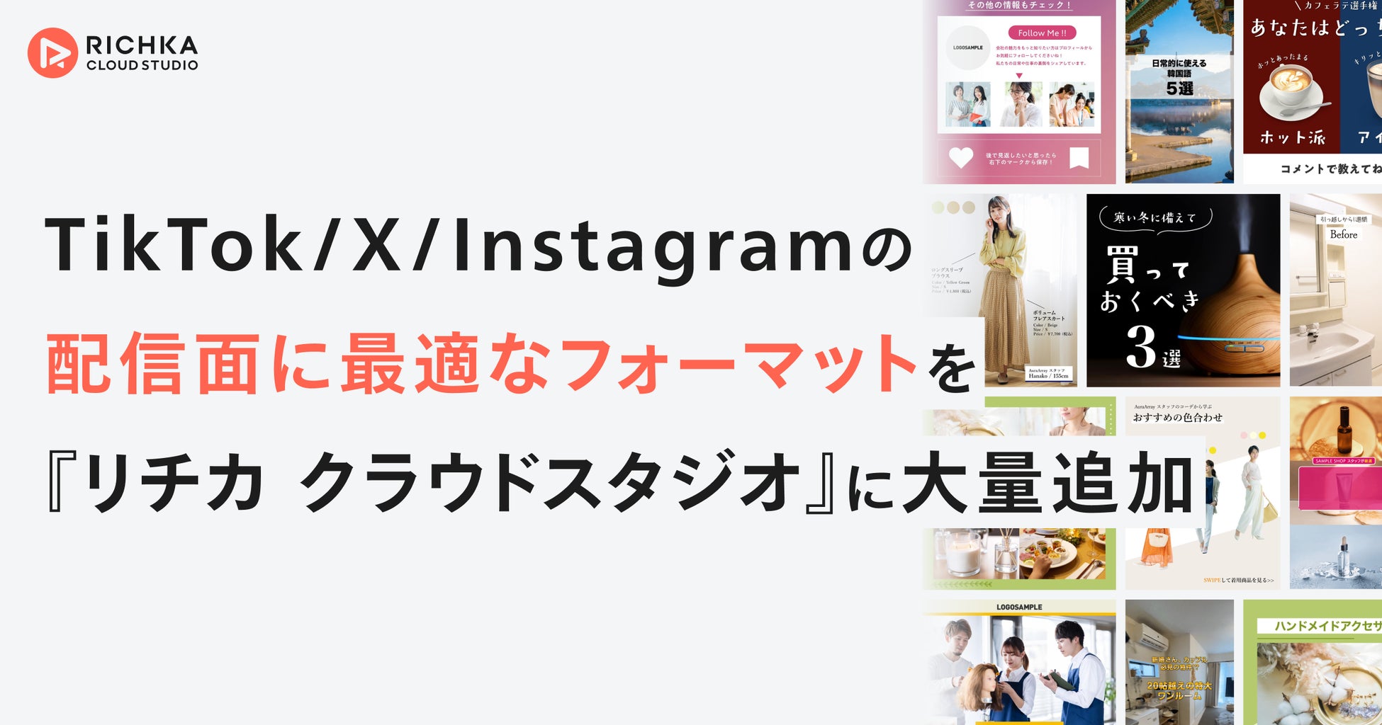 株式会社リチカ(本社:東京都渋谷区 / 代表取締役:松尾幸治 / 以下、当社)は、AIマーケティング・アシスタント『リチカ クラウドスタジオ』のアップデートとして、TikTok/X/Instagramの配信面に最適化したフォーマットを追加したことをお知らせします。