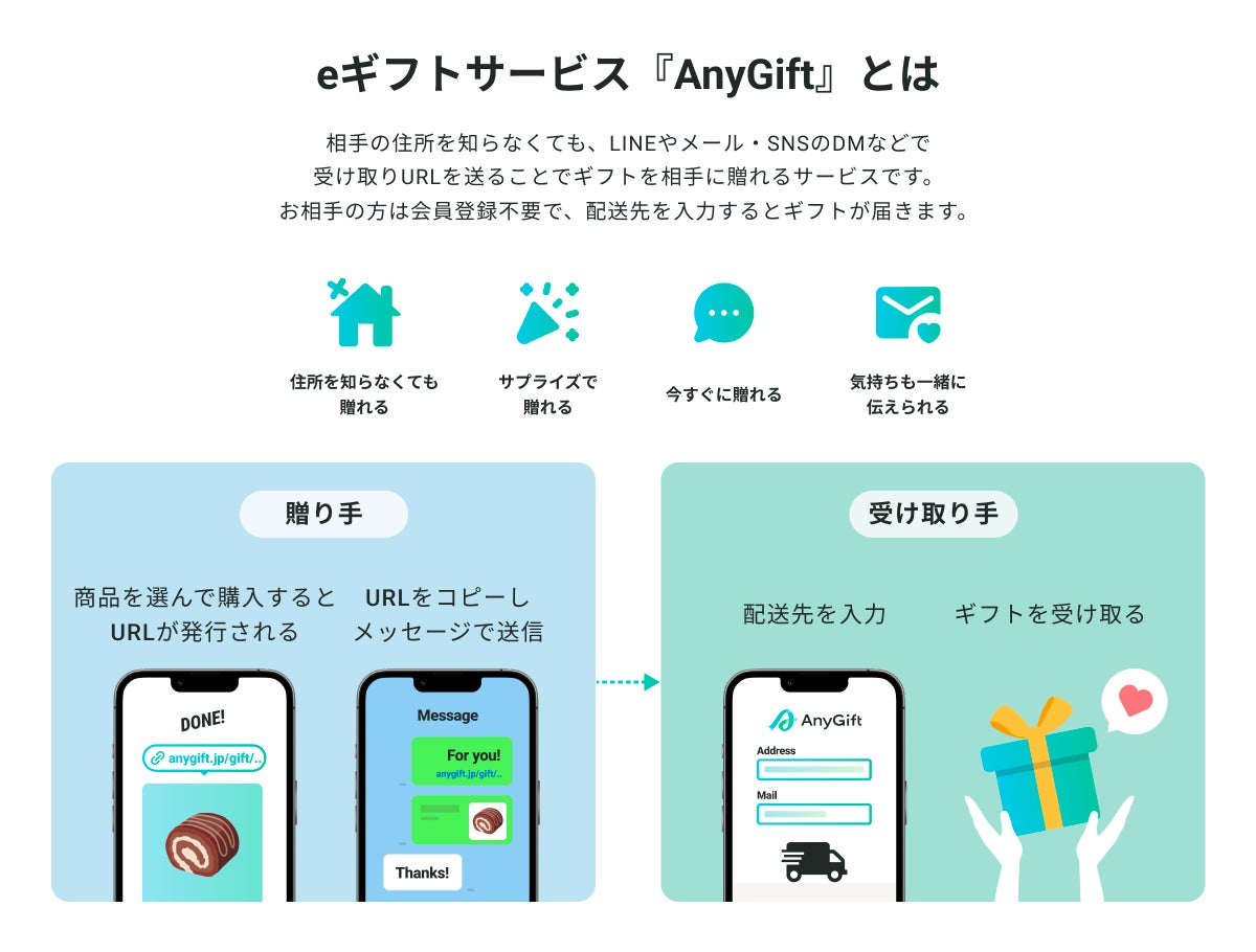 「AnyGift(エニーギフト)」は、相手の住所を知らなくてもLINEやメール・SNSで気軽にギフトを贈れる「eギフト」機能を、ノーコードで自社ECサイトに組み込むことができるサービスです。