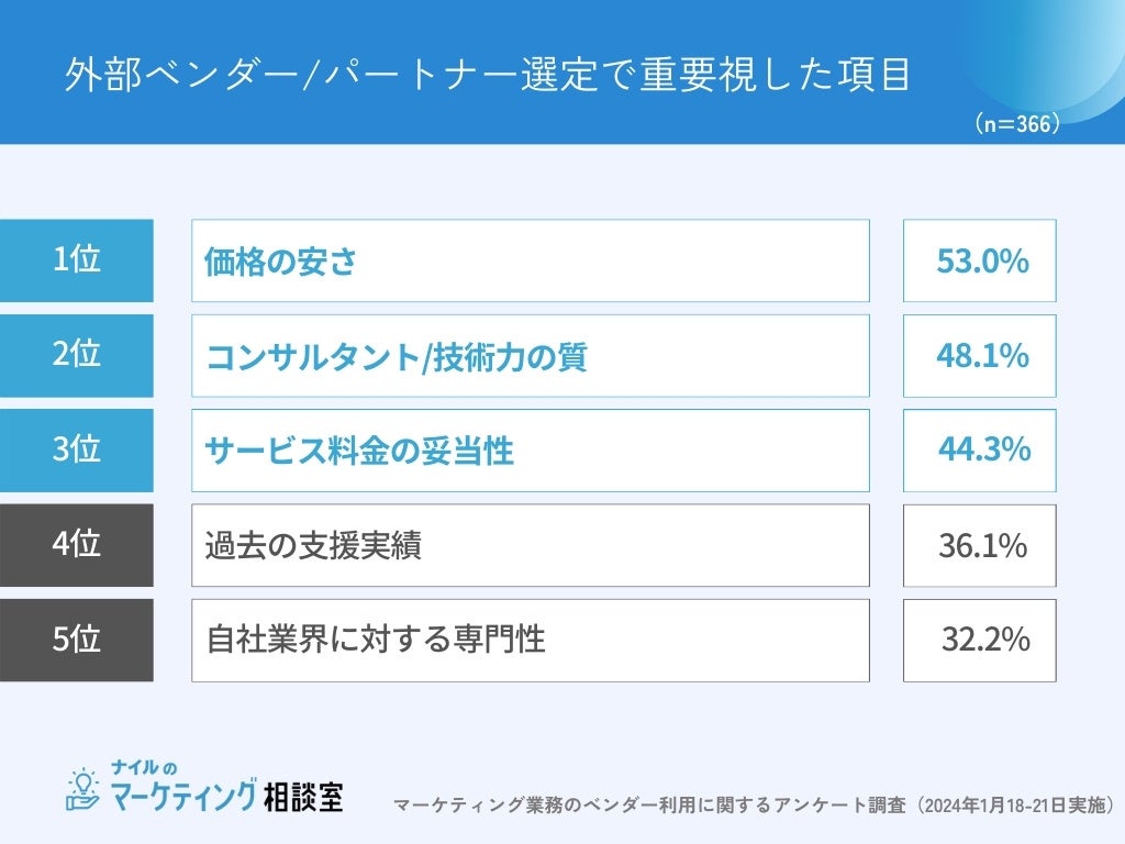 デジタルマーケティングにおける外注先の選定基準を聞いたところ、全体の約5割が「価格の安さ(53%)」を重要視していると回答。ついで「コンサルタント/技術力の質(48.1%)」、「サービス料金の妥当性(44.3%)」が続きました。