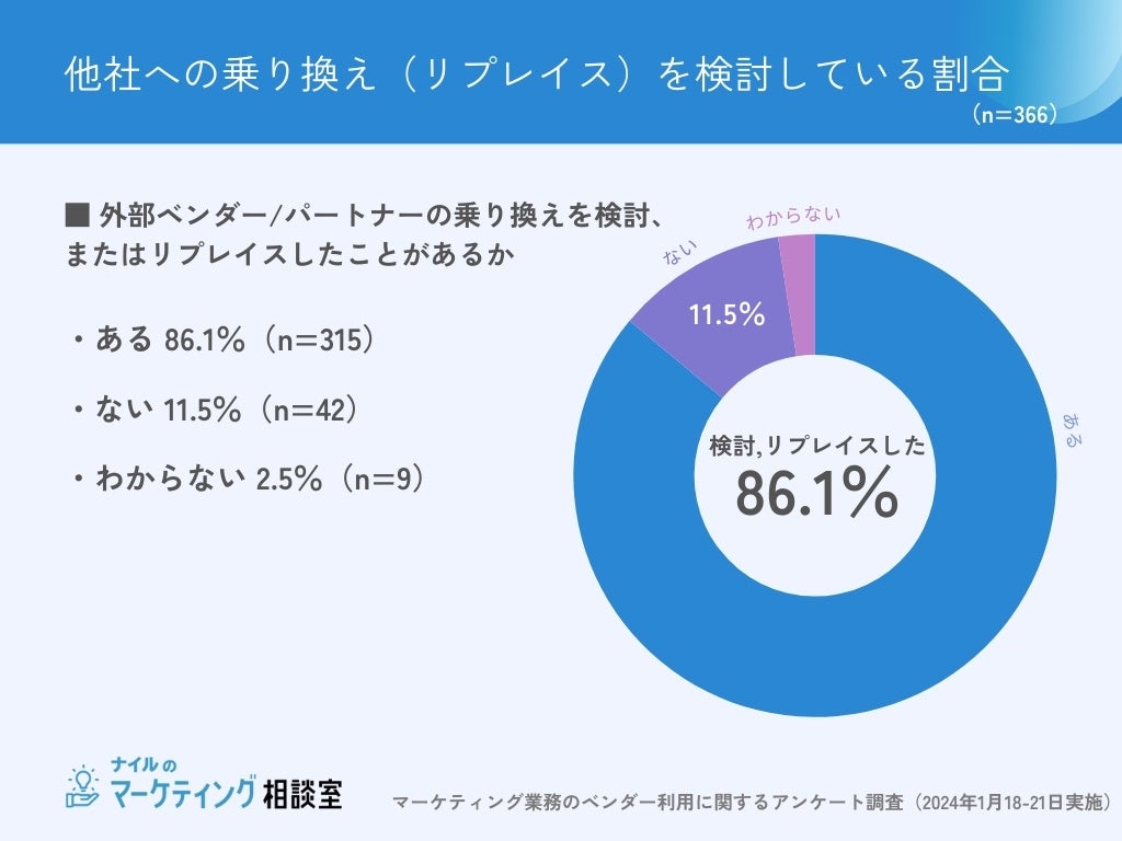 これまで外注したことのある366名を対象に、外部ベンダー/パートナーの乗り換えを検討したことがあるか、または乗り換えたことがあるか聞いたところ、約9割が「ある(86.1%)」と回答しました。
