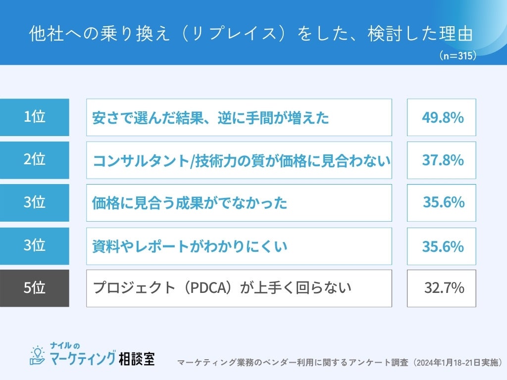 他社への乗り換えを検討した315名に理由を聞いたところ、1位は「安さで選んだ結果、逆に手間が増えた(49.8%)」でした。
