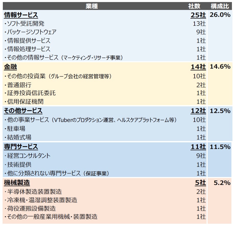 また、VTuberプロダクションの運営事業を手掛けるカバー (東証グロース)など「その他サービス」が12.5%(12社)だった。