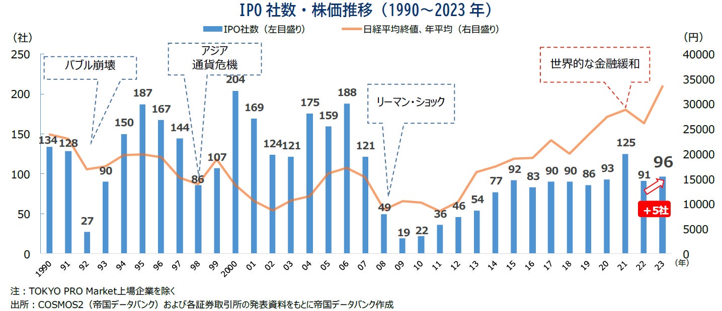 2023年の国内株式市場は、円安による企業業績の改善やデフレ脱却への期待、米国の「利上げ終了」の示唆、海外勢による日本株の再評価などが寄与し、日経平均株価は年間で28.2%(7,369円67銭)上昇した。上昇率は日本銀行が異次元の金融緩和政策を導入した2013年以降で最も高く、上昇幅はバブル絶頂期の1989年以来の高水準で、歴代第3位となった。こうした市場環境のなか、新規株式公開(IPO)社数は前年の91社から5社増加し、96社となった。