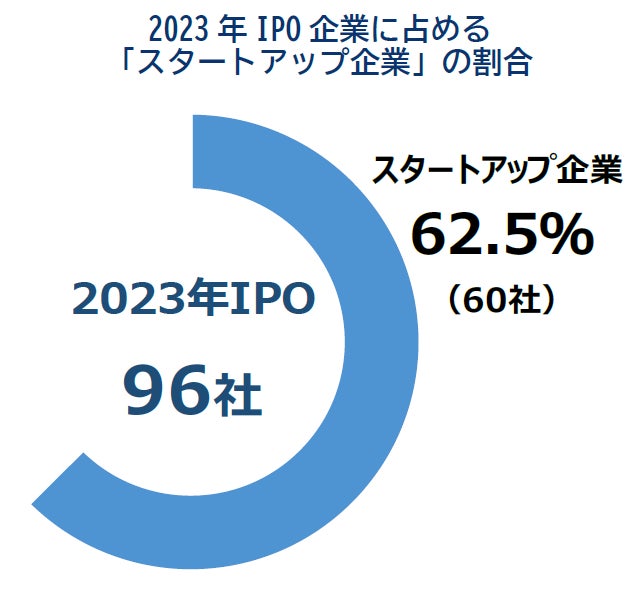 「出口戦略」(イグジット、EXIT)としてIPOを目標に据えているスタートアップが多いなか、2023年IPO企業96社のうち「スタートアップ企業[1]」は60社と、全体の62.5%を占めた。