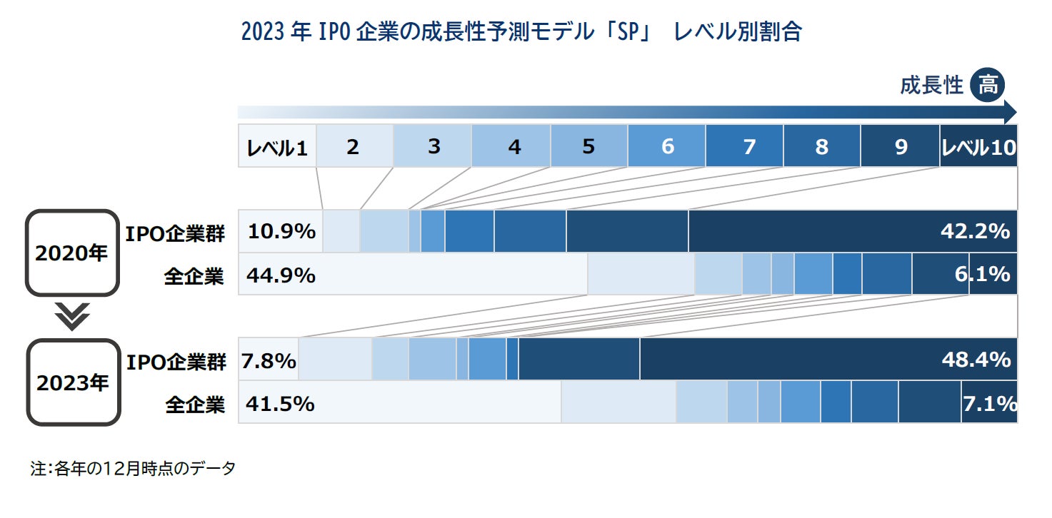 その結果、分析が可能な全24万社と比較して、IPO企業では高いポテンシャルが数値として現れる結果となった。2023年12月時点において、3年後に売上高が1.5倍以上になる可能性[TDB1] が最も高い「SPレベル10」の割合は、全企業[TDB2] では7.1%だったのに対して、2023年IPO企業群では48.4%と全企業の約7倍にのぼった。IPOを果たす3年前である[TDB3] 2020年以降、各時点のいずれも同様な結果がみられている。