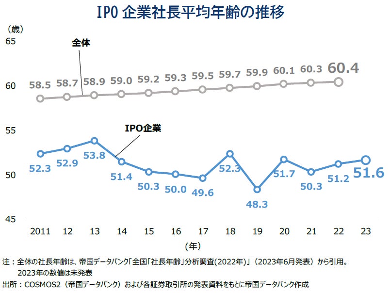 設立から上場まで、前年より1.3年伸長。社長平均年齢は全体より若い50代前半の傾向続く