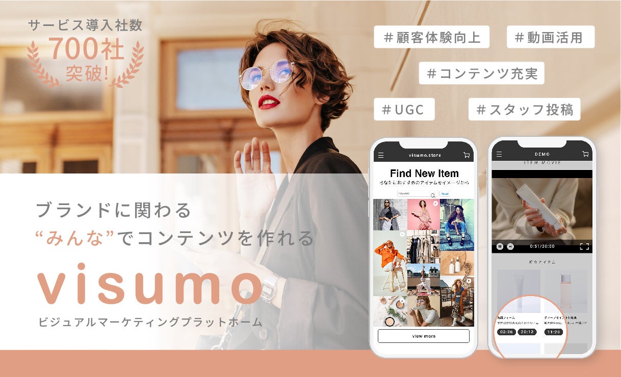 visumoはブランディングや商品訴求を強化するビジュアルデータを一元管理するビジュアルマーケティングプラットフォームです。導入実績は国内700社を超え、インスタグラム上のUGC(※)を活用する機能やYouTubeなどの動画データをオウンドメディアで活用する機能、スタッフのリソースを活用してコンテンツ投稿を強化する機能など、事業者様のウェブサイトでのデジタル接客を強化するサービスを提供しています。