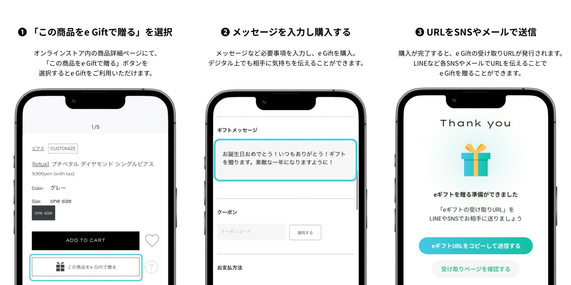 オンラインストア内の商品詳細ページ、またはカートページで「この商品をe Giftで贈る」を選択するとe Giftをご利用いただけます。
