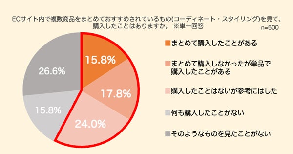 複数商品がおすすめとしてまとめて表示されているもの(コーディネート・スタイリング)を全体の半数以上が購入時の参考にしており、さらにそれをきっかけに購入したことがある人の約半数が【まとめて購入したことがある】を選択しているため、コーディネートやスタイリングが購買促進効果や単価アップにつながることがわかりました。