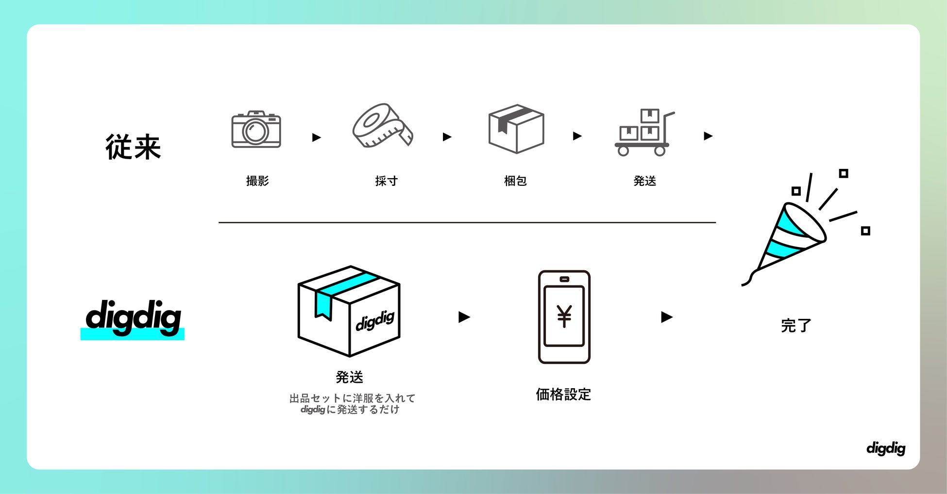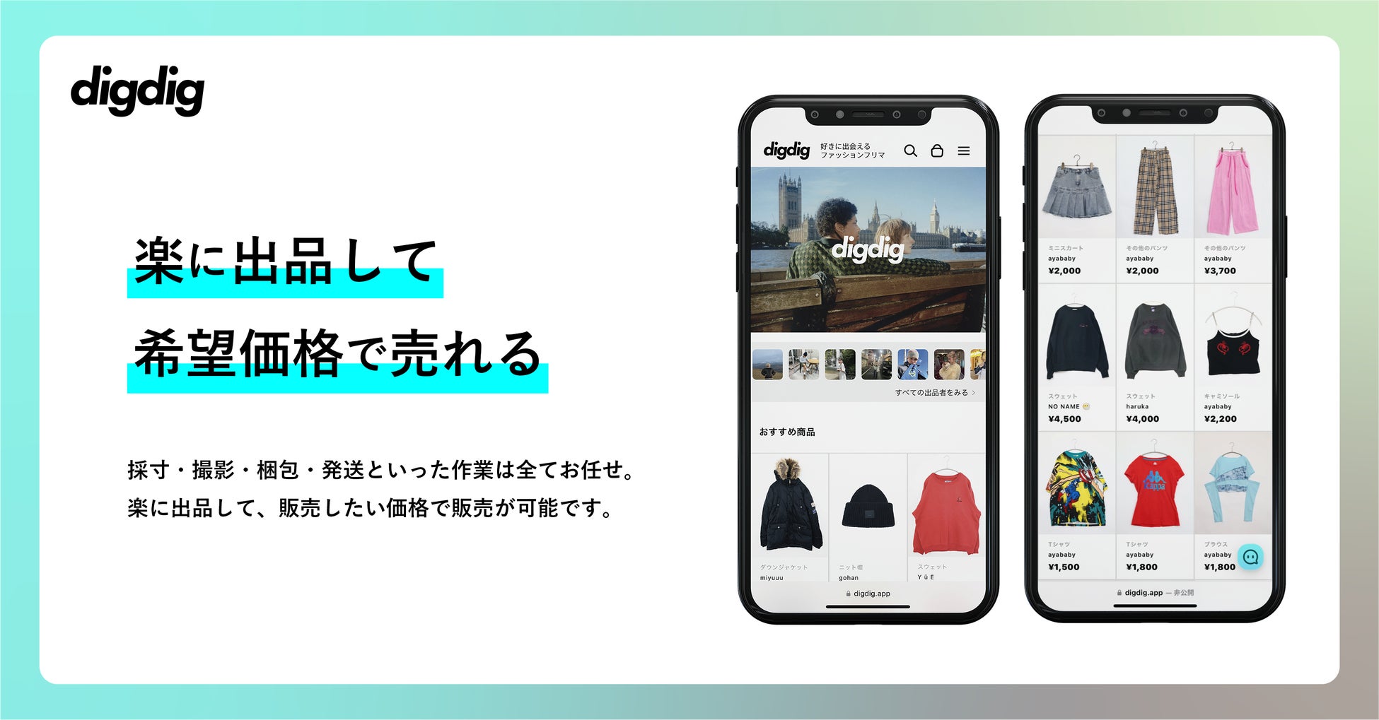 「不要な洋服を楽に出品したい」と「不要な洋服を希望する価格で売りたい」を実現させるファッションフリマサービスです。出品希望者は、digdigから送られてくる袋(出品キット)に洋服を詰めて発送し、希望する販売価格を入力するだけで、出品作業は終了。採寸・撮影・梱包・発送業務は全てdigdig側で行い、洋服を販売いたします。