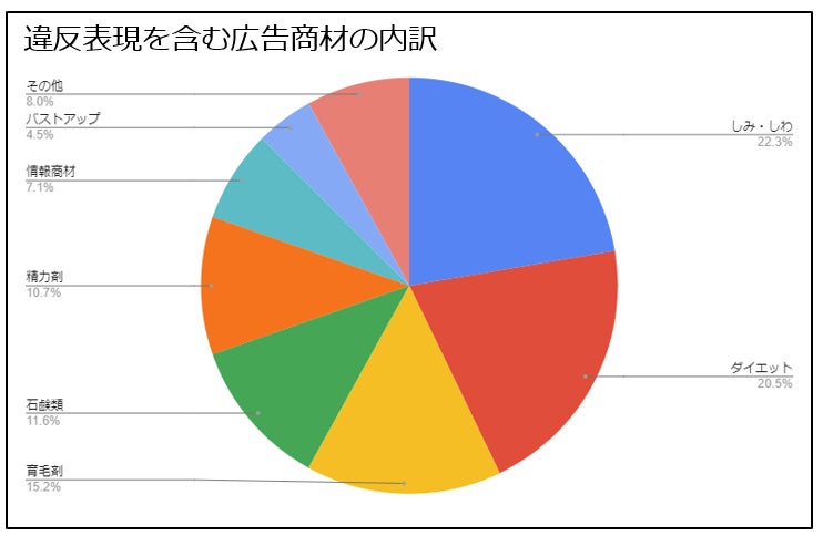 最も多く確認されたのは、しみ・しわに関する効果を謳う美容健康商材(22.3%)、次いで、ダイエット効果を過度に謳う商材(20.5%)、育毛剤(15.2%)、石鹸類(11.6%)と続きました。また、情報商材においても法令違反となり得る表現を伴った広告が多く確認されています(7.1%)。